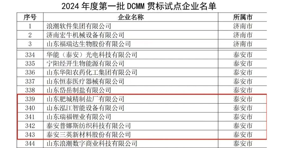 近日,山東省工信廳公示了2024年度第 一批DCMM貫標試點企業(yè)名單,泰安市共13家企業(yè)獲評,我公司成功入選,標志著我公司兩化融 合工作再上新臺階。